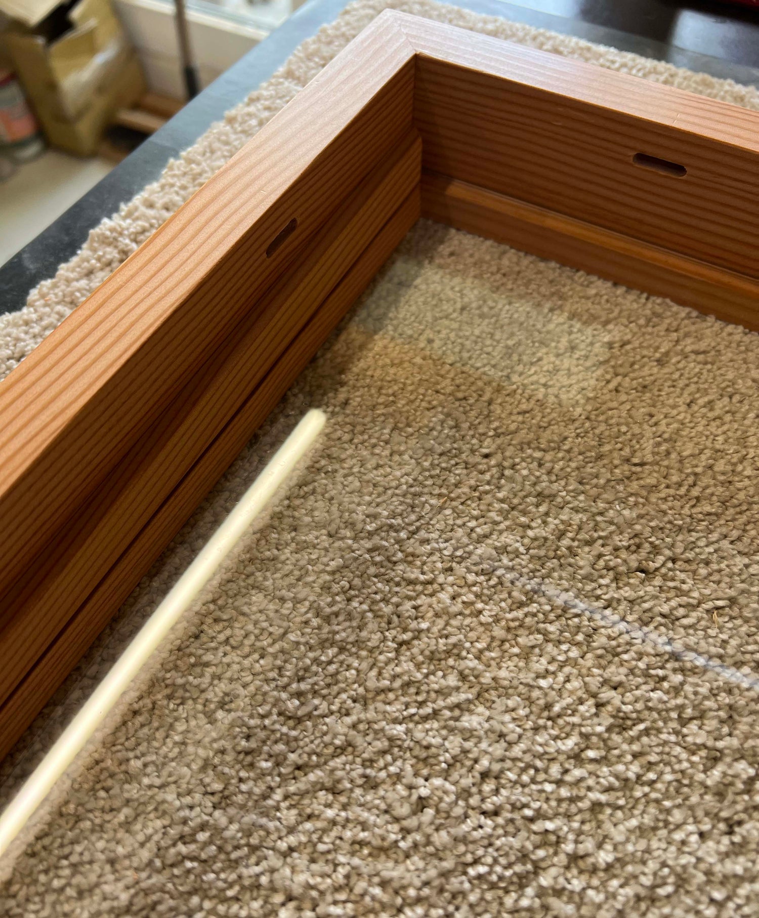 Available with custom carpented frame in Oregon Pine wood, dept: 5,5cm. Incredible craftmanship by Carpenter Jes Uldal.